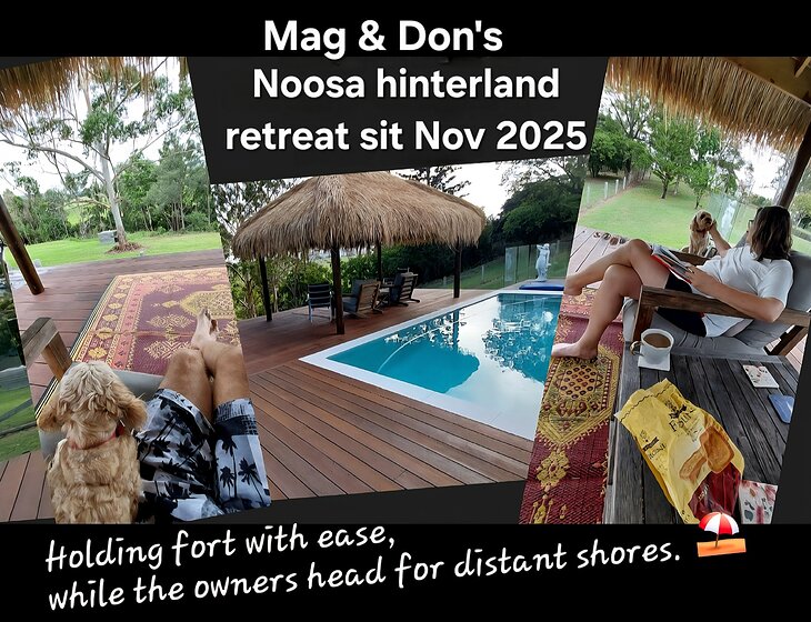 - Prior again, was a Noosa Hinterland rural acreage retreat sit. A ridgeline, clever layout home taking in a killer view. Owners headed overseas while we cared for all and chilled by the pool with lovable cavoodle company. A win, win situation for all, and another 5-star review. See M&D's Nov 2025 sit photo collage.