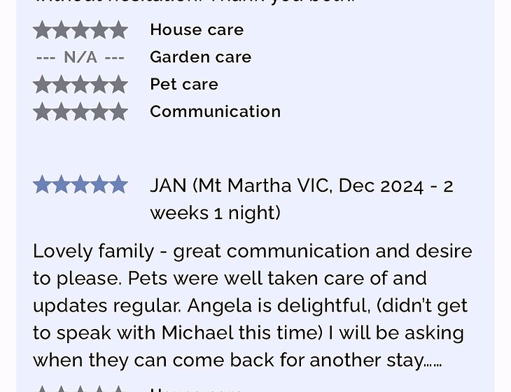 We are a caring family of 3 who love all fury friends big and small. We are very kind and caring towards all animals & your property will be well taken care of. My husband and I grew up with dogs and cats, we currently have a pet chook who is living out her best years with is in tropical heaven, noosa Qld. We have sat for many wonderful fury friends as you can see below. We love coming back to our hometown on the Mornington Pennisula to visit friends and family. We have many great references from multiple house sits over the years . Your animals and home will be well looked after by us.