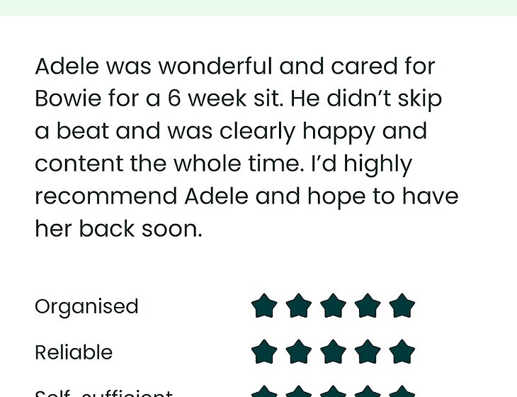 Hi! My name is Adele. I love animals and being out in nature.I don't have a pet of my own at the moment, and would love to get my doggie fix and help you out at the same time!