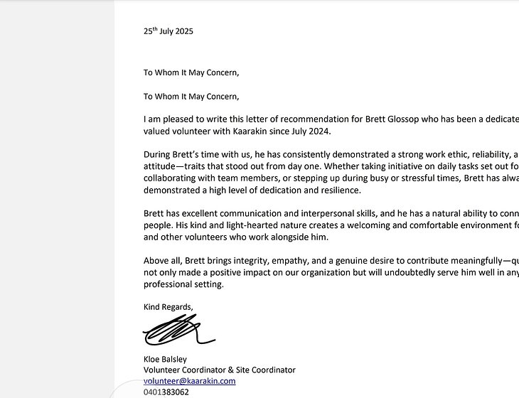 Currently enjoy Volunteering at Foodbank , and Kaarakin cockatoo rehab centre. Been working with the latter for 1 year. As an animal carer essentially. Respectful of your house and belongings. My police check is now up on site. Be glad and honoured to look after your animals while they miss you.