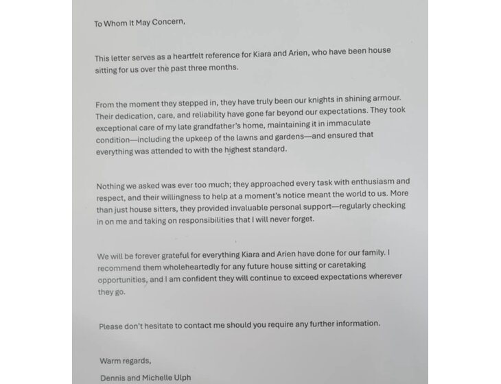 We’re both active, healthy individuals, so if your pets love walks, playtime, or just being around positive energy — they’ll be in great hands. At the same time, we’re calm, respectful, and committed to maintaining your home to the highest standard.