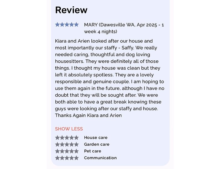 We absolutely love what we do — caring for animals, exploring new places, and giving homeowners peace of mind while they’re away.