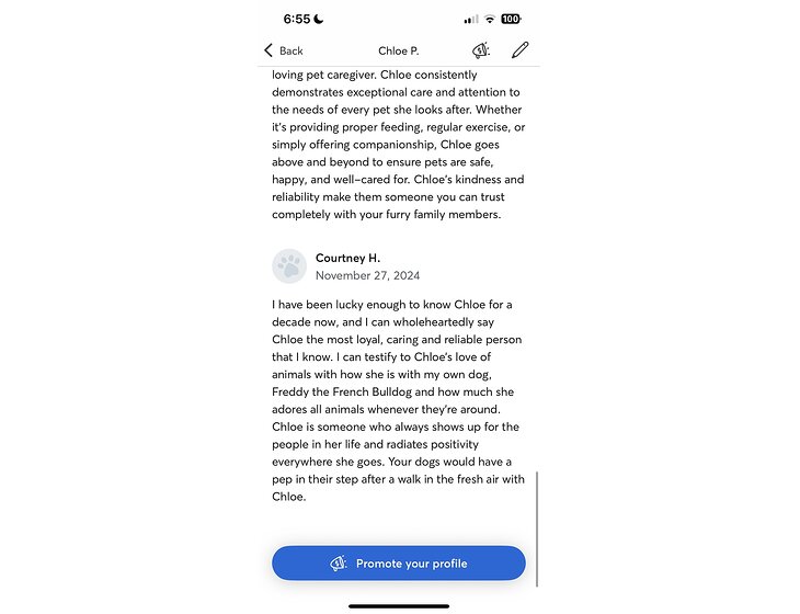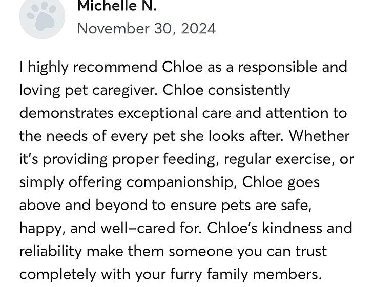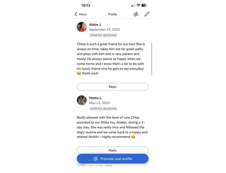 I’m originally from Australia and have been living in the UK for the past 4 years. During that time, I’ve built up consistent experience through Rover, completing walks, drop-ins, daytime sits and multi-day stays with wonderful repeat clients.