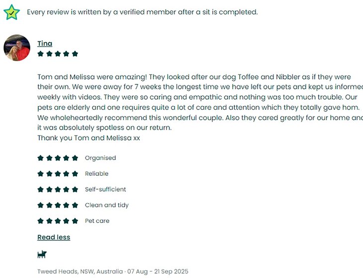 Hi there! We’re Marissa and Tom, a mixed Australian and English couple with a decade of house and pet-sitting experience across Australia, the UK, and Europe. We pride ourselves on providing exceptional care for pets, homes and gardens.