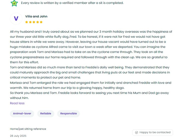 As seasoned travelers, house sitters and frequent Airbnb users, we understand the trust it takes to invite someone into your home. We are new to Mindahome but we have an established Trusted House Sitters and Aussie House Sitters profiles with references. Our Airbnb profiles also show over 50 positive reviews: we have a proven track record of being reliable and considerate guests. Further house and pet sit references and police checks available via message through attached files.