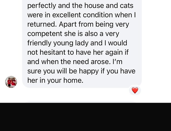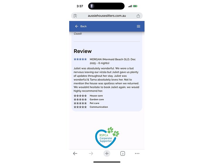 I've completed several house sits across NSW, QLD, and SA for both cats and dogs. As a caring animal lover who enjoys nature and beach walks, I'm confident I'll be perfect carer and company for your pets. I'm very house-proud and happy to complete general house and gardening duties. I'm a non-smoker, don't drink, and follow a mostly a vego diet – I'll cook and handle meat for your pets where required of course! 🙂 I'm currently based in Brisbane and available to house sit from Noosa, Sunshine Coast, Brisbane, Gold Coast, Byron Bay, Sydney and surrounds ☺️