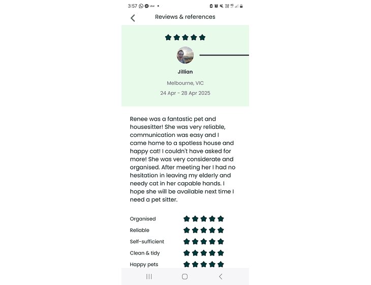 Hi there! I'm Renee and I have been housesitting privately and through apps for two years now. I have been fortunate to look after some beautiful animals in very lovely homes around Adelaide, Melbourne and New Zealand. Generally I'm fully booked in advance although I recently took off time for travel and tour hosting work. I have been invited back to all previous sits which has allowed happy and trusted bonds to form between myself, the animals and owners. I work in tourism as a tour host (professional people wrangler and logistical tour wizard) I've also worked as accommodation manager in hostels and hotels. Looking after things is what I do! I am happy to share reviews from the other app, I am also happy for a meet and greet in person or a video call to answer any questions, help alleviate any anxieties and ensure it's a match. I understand how important it is to ensure you feel comfortable having me look after your home and fur family!