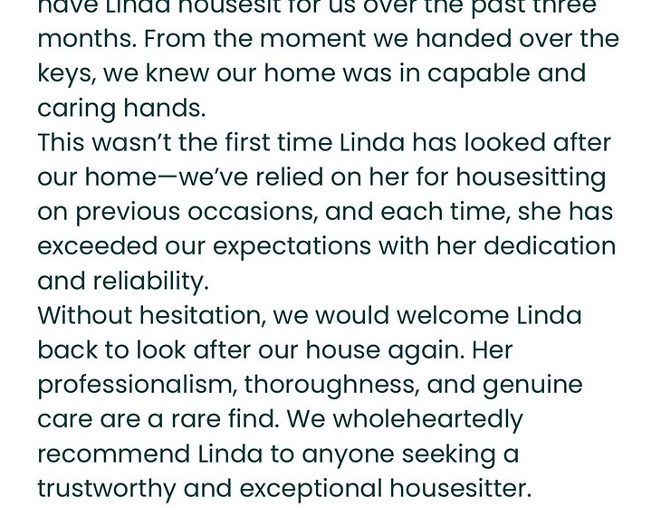 I’m new to this particular platform, but you can view screenshots of 5-star reviews from my Trusted House Sitters profile in my photos. Many of those homeowners are happy to be contacted directly for confirmation. I can also provide a link to my Airbnb page, which includes numerous excellent guest references. I also have a current police check.