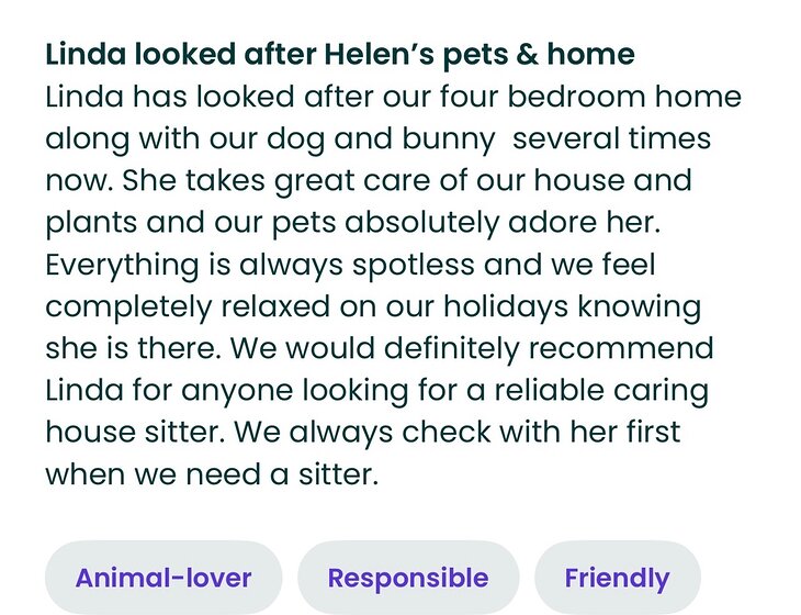 I enjoy giving pets plenty of attention, walks, and cuddles, and I’ll happily keep you updated with photos and messages for peace of mind. I’m always happy to chat and answer any questions so you can feel confident your home and pets will be well cared for.