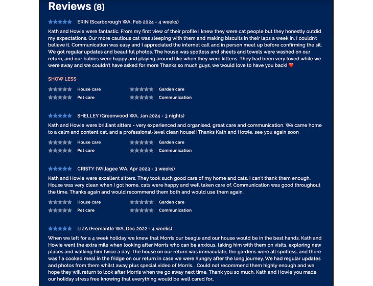 Here you can find excellent reviews on our social media & other housesit profiles and our 5-star rating and reviews on Airtasker, which we have used to do gardening maintenance work. We often create videos of pets for their owners and you can find some examples of them there too. Read more...