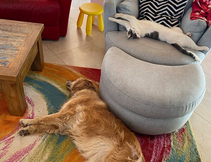 I travel with my Thunderpaws, a very well-trained tuxedo cat who is unbothered by other animals and leaves no evidence of her presence (besides good vibes).