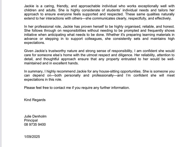 I’m a bit of an introvert so won’t be having anyone over. Obviously i’m new to this so don’t have references for house sitting but have attached a reference from the principal of the school i worked at (last pic) and can give details for personal/work references if required. Can also provide links for the house we recently sold so you can see how we kept it. Happy to get a police clearance if required. Feel free to ask any questions 😊