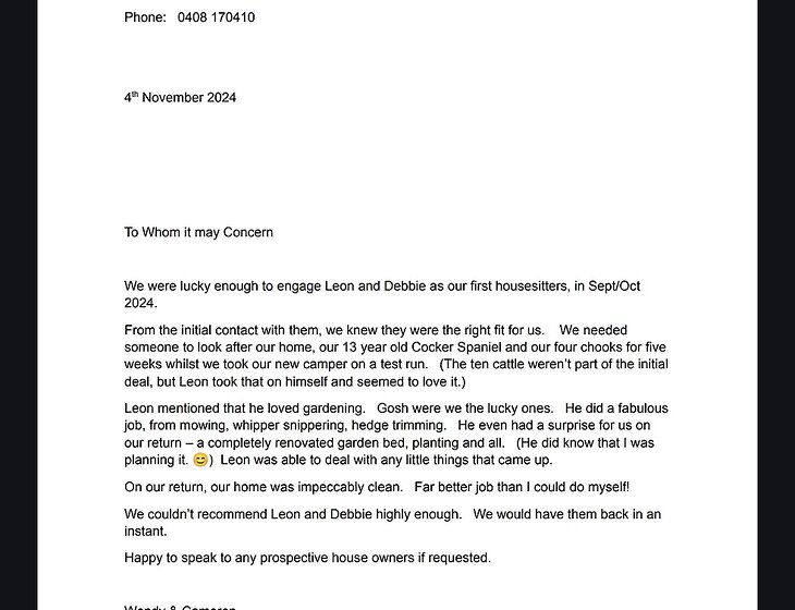 Hi we are retired couple living and travelling in our caravan we love animals having two small dogs and a budgie. After having a cleaning business for 15years we know how important it is to have a clean and secure home and privacy, after having VIP clients we know how to take care of your home and animals. We live in our caravan and love gardening, spent three years working on vineyards in Clare valley
