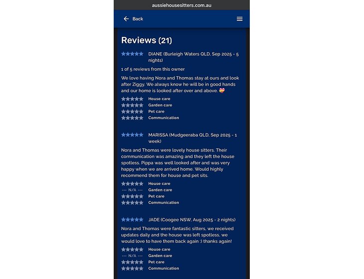 Nora is a psychologist and she is also a hobby home/furniture renovator and home organiser. Thomas is a cameraman, car mechanic, and a carpenter in the making. We both love to renovate and build things, and we like to admire architecture. We are both quiet, mature, responsible and handy people. We don't smoke, drink or party. We like to live a simple life, appreciating the small joys of it, like spending time with pets, watching the Australian wildlife, cooking healthy meals and exploring new neighborhoods by long walks. We are house proud and always aim to leave places better than we found them.