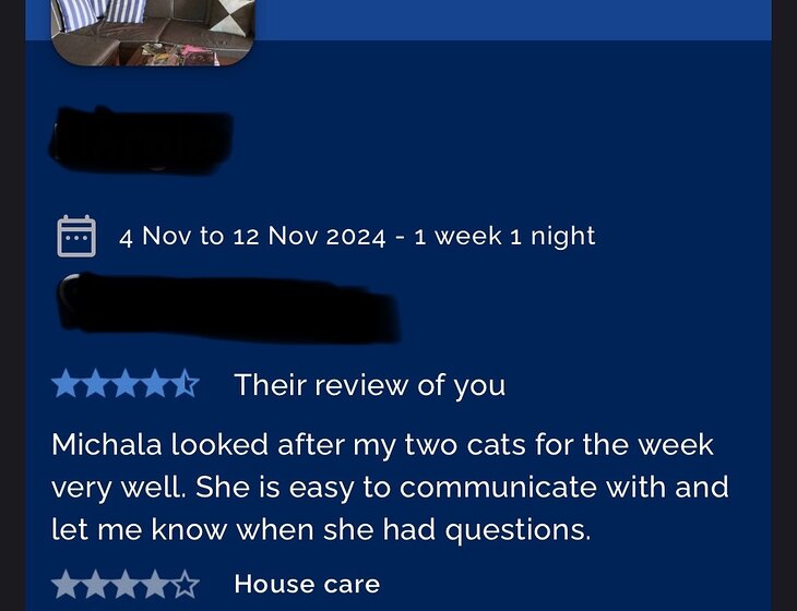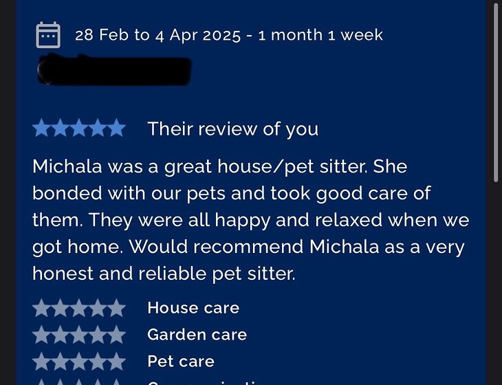 I’m Michala. I am a reliable, open minded, friendly and empathetic individual who would love to be able to look after your home and/ or animals.
