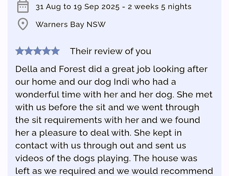 I am a responsible, reliable mature age person who is respectful of other people's property and possessions. I have a fury friend of my own, so am very familiar with their needs and also that they are a member of one's family and very precious. I decided to rejoin House Sitter again as I love travelling around this great country of ours, but my fury co-pilot (Forrest) will be with me. Forrest is non shedding, house trained, well behaved and gets along great with other dogs. Unfortunately he doesn't get on with cats.