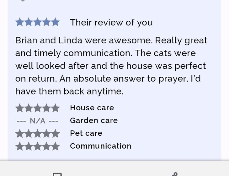 We have sat for friends and family and we look after our daughters cats and house when they go on holiday. We have completed house /pet sits in Uk and Europe using another site (refs available from those sits if required ) We have experience looking after multiple cat households.