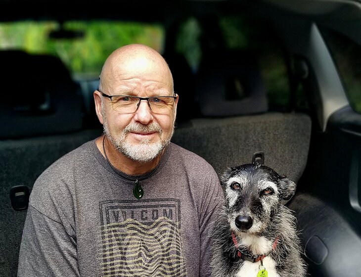Hi my name is Mic and I am in my early 60s and travelling around with my best mate Shadow (3yr old X Dalmation).