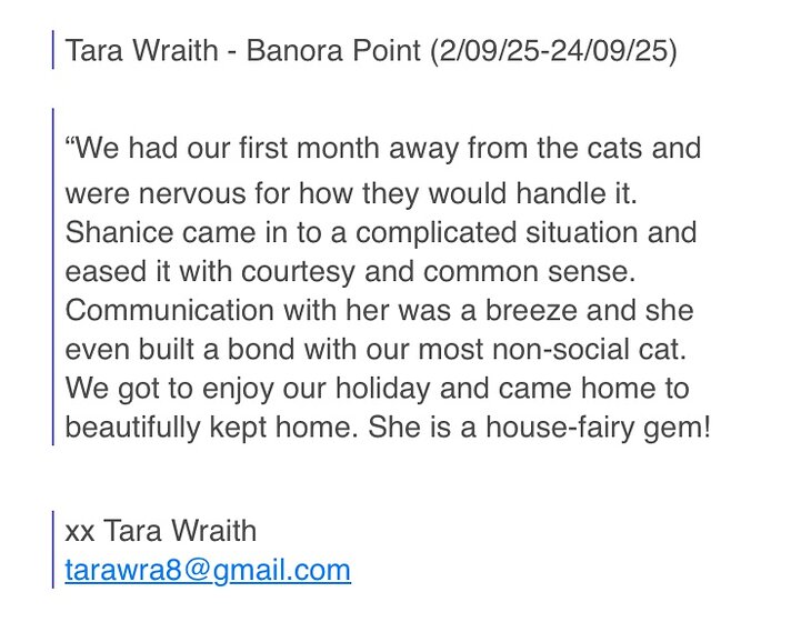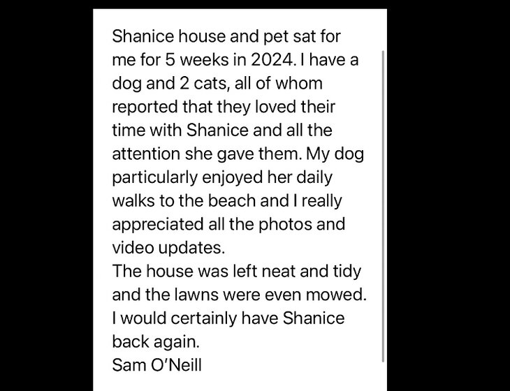 I am honest, reliable, clean, caring, positive person and I absolutely love animals, I also enjoy being in the garden/nature. I am the eldest of 4 girls and am a proud Aunty of 3. 🤍Family is very important to me.