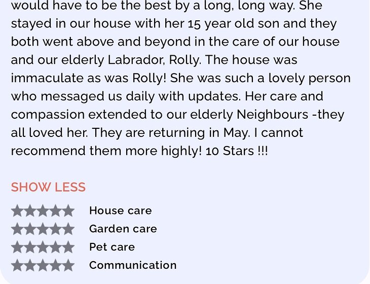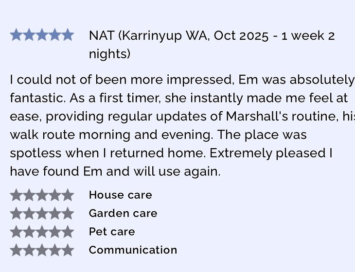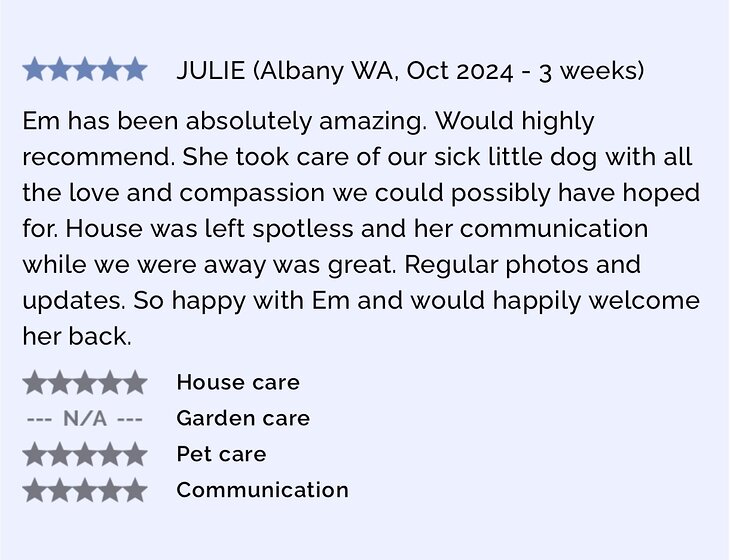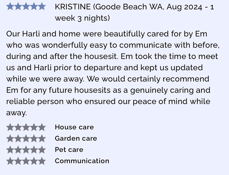 Previously employed as a Hotel Operations Manager for Disney and a Major Events Operations Coordinator at Optus Stadium, I'm a capable, organised and responsible housesitter.