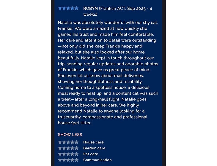 Coming home to a spotless house, a delicious meal ready to heat up, and a content cat was such a treat-after a long-haul flight. Natalie goes above and beyond in her care. We highly recommend Natalie to anyone looking for a trustworthy, compassionate and professional house/pet sitter.” - Robyn (Franklin ACT, Sep 2025)