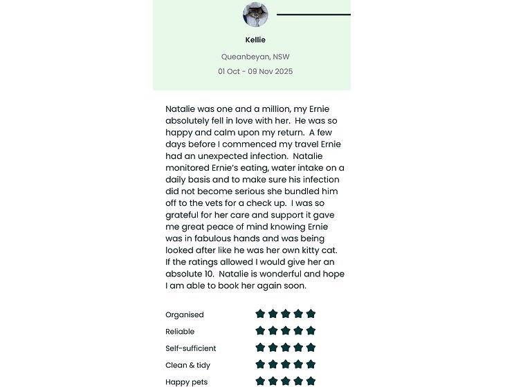 “Natalie was one and a million, my Ernie absolutely fell in love with her. He was so happy and calm upon my return. A few days before I commenced my travel Ernie had an unexpected infection. Natalie monitored Ernie's eating, water intake on a daily basis and to make sure his infection did not become serious she bundled him off to the vets for a check up. I was so grateful for her care and support it gave me great peace of mind knowing Ernie was in fabulous hands and was being looked after like he was her own kitty cat. If the ratings allowed I would give her an absolute 10. Natalie is wonderful and hope I am able to book her again soon.” - Kellie (NSW, Nov 2025)