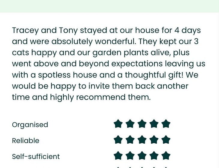 Hi we are a professional couple taking a year out from our careers as a Teacher and Parts Manager.We lived in NZ where we had over 2 acres of property with various animals including cats, goats, chickens and dogs. We are very caring and would love to look after your Pets. Whilst there are no reviews on this website we have been doing sits in Vienna and London and have completed further sits in Brisbane Via Trusted House sitters. Please feel free to reach out IF you require further references OR Reviews. We are now free 4th-7 Nov then 9-12 Nov Then 21-30Nov Thanks.