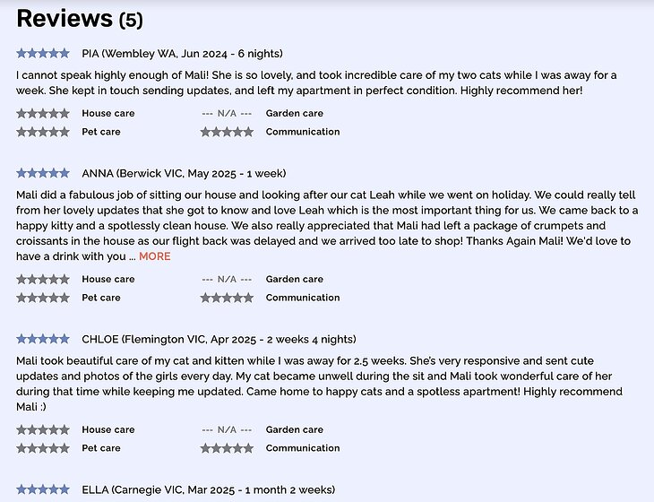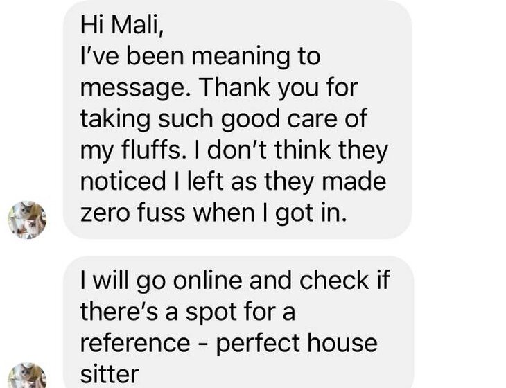 I am new to this site, however please ask and I will send you my profile with 5 star verified reviews over on Aussie House sitters