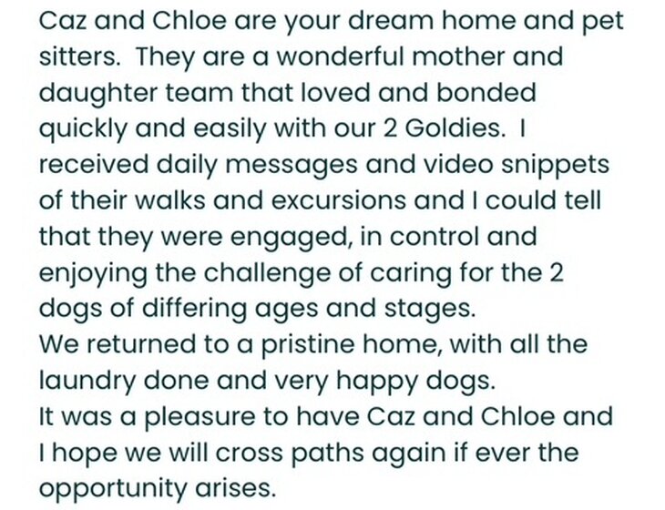 Hi. We are a mother/19 yo daughter house sitting team with many years of experience. We have looked after homes of many sizes with dogs, fish, birds, chooks, alpacas, guinea-pigs, lawns, gardens, pot-plants, and pools.
