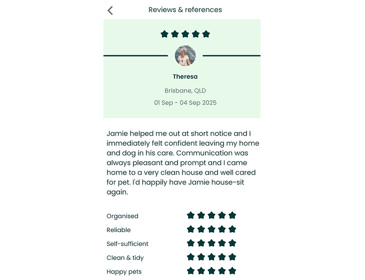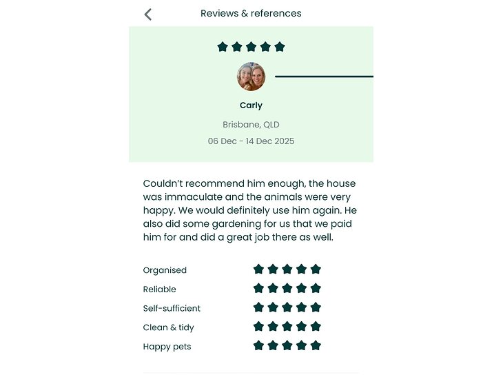 Backed by plenty of 5⭐️ reviews (I'm mainly on Trusted House Sitters & Aussie House Sitters apps - see attached reviews), I’m committed to giving you complete peace of mind while you’re away. Let’s chat! Read more...