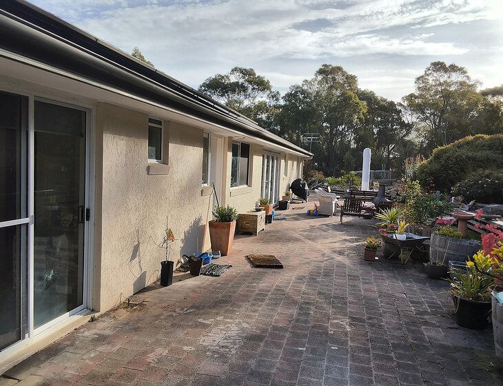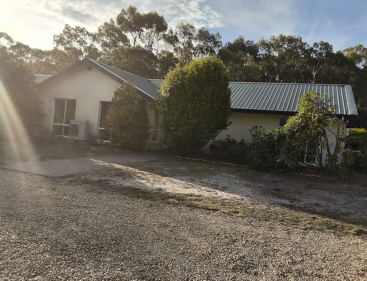 180 square metre faceing north. Very warm. Can view on google maps. Bush block surrounde by trees. 2 bedrooms available. Alarmed. Secure electric gate. 100 square metre paved area on north side. Wood availed for out door fire
