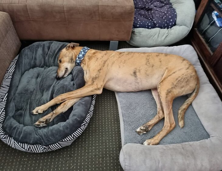 Geoffrey is a senior greyhound who needs to be walked in the cooler times of the day. Around 20 mins is fine. He cannot be allowed to exercise (including running in the yard) after eating - this can be fatal. Exercise and walking can only be at least 2 hours AFTER eating or 30 mins BEFORE eating.