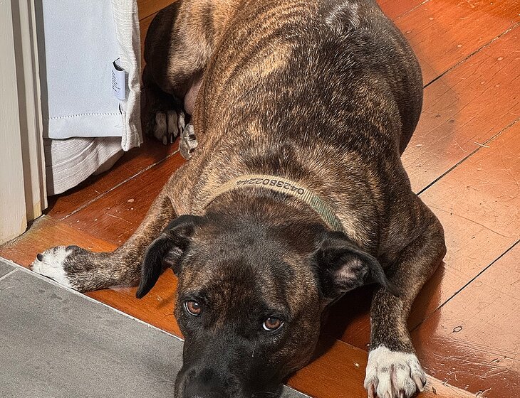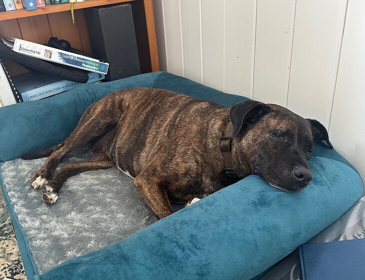 Our dog is a quiet and calm girl, who prefers to spend her days lounging outside on her bed, or is equally happy snoozing inside any room you happen to be in. She’d love at least one walk a day (preferably two!) otherwise is very low needs. She loves all people and dogs, her tail immediately wagging as soon as she spots anyone in the distance.