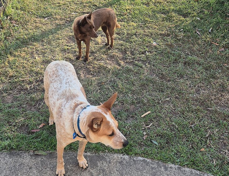 We have 2 dogs, Molly (10) little red kelpie you might describe her as aloof, happy hanging with herself, Harry (18 months) red cattledog cross, exuberant, boisterous and loves cuddles alot.