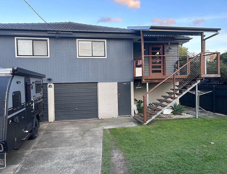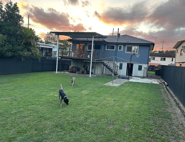 Our home is a highset, 3 bedroom home with open plan kitchen and dining area and lounge. We have a large rear garden, lawn only and a beautiful back deck. The area under the house is primarily gym/storage and can fit 1 small car.