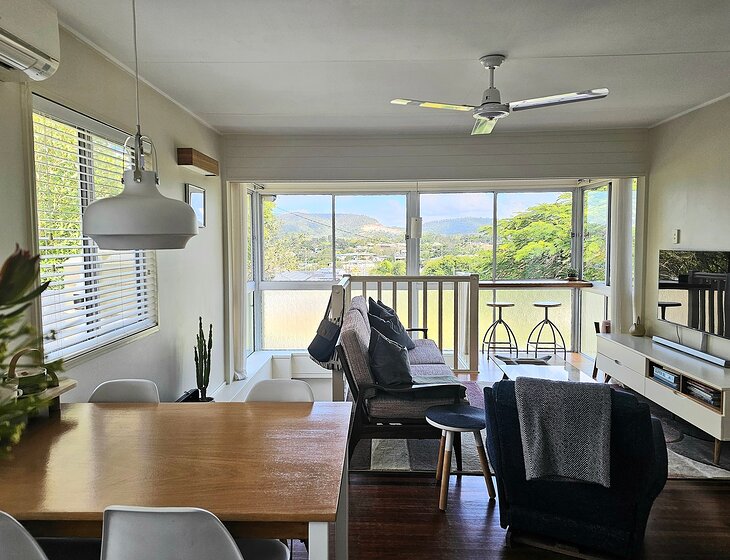 Our home is open-plan, bright and breezy upstairs with beautiful mountain views. Downstairs, you’ll find a cozy second lounge with a projector, perfect for movie nights. There's air-conditioning in the living area and one bedroom, plus ceiling fans throughout.