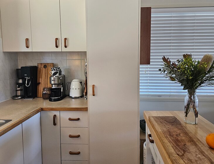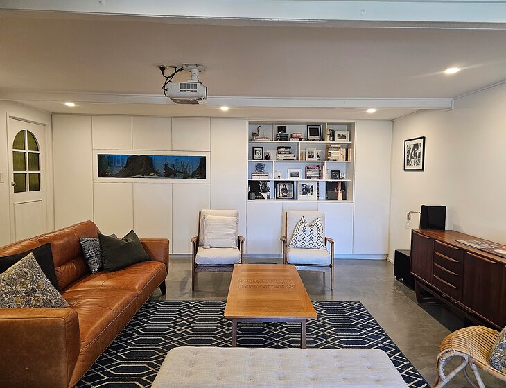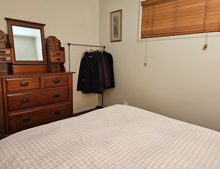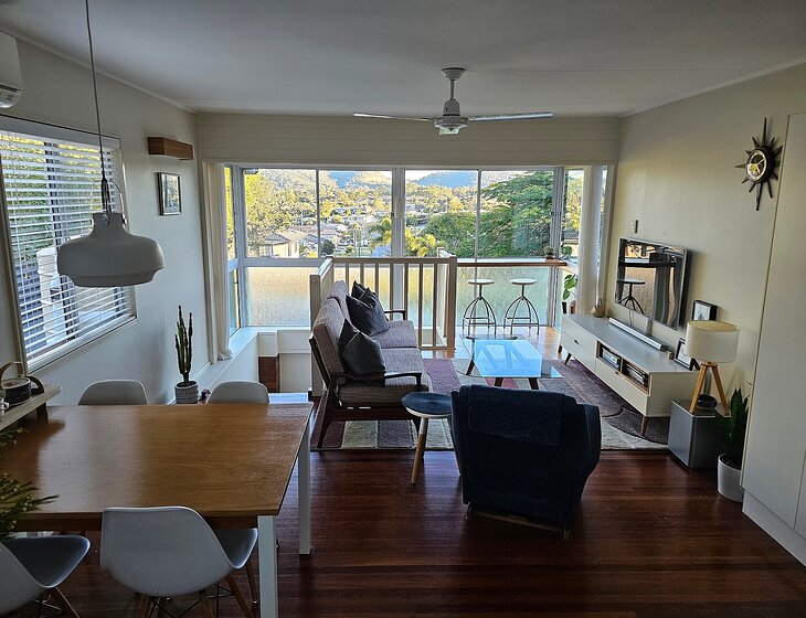 Our home is open-plan, bright and breezy upstairs with beautiful mountain views. Downstairs, you’ll find a cozy second lounge with a projector, perfect for movie nights. There's air-conditioning in the living area and one bedroom, plus ceiling fans throughout.