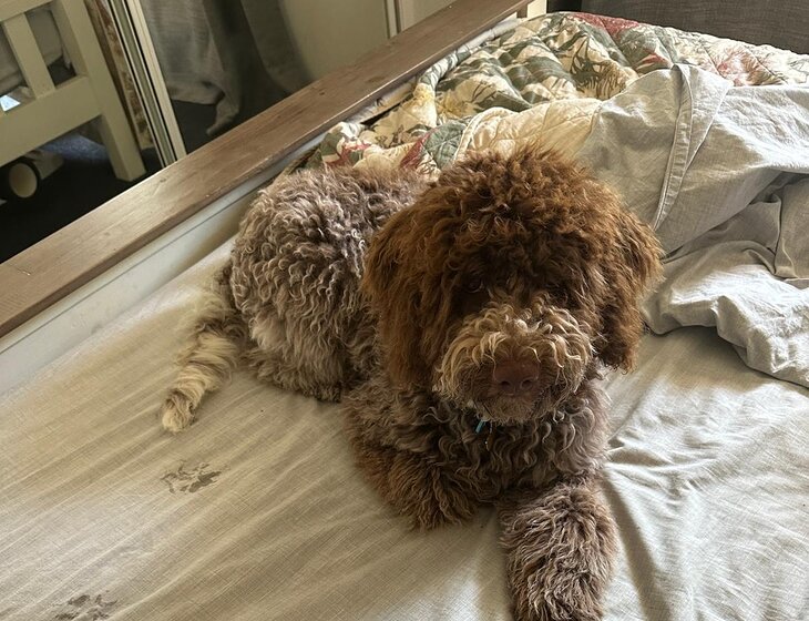 We have a pool and a 2-year-old Lagotto called Coco.