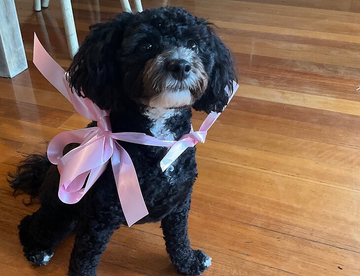 We have a small energetic bichoodle who loves everyone.