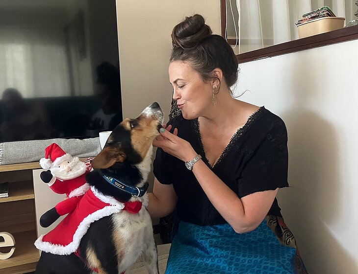 We have a well trained intelligent Kelpie named Kit (Kitty) she is 7 years old and loves belly scratches and chasing the ball on the beach or at the park. She’s not usually very interested in other dogs but is very gentle and occasionally enjoys dog companions but usually prefers human companionship.