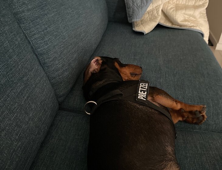 My doxie is a inside dog and is usually walked around a lovely lake once a day