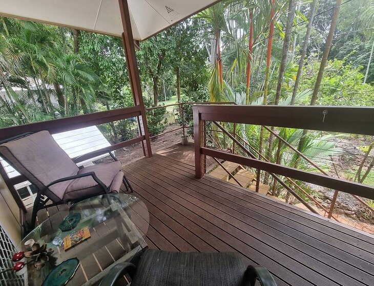 Elevated home in Batchelor on the edge of Litchfield National Park (full of waterfalls to swim in and walk around). The home office has a lovely view, with birds often feeding in the trees that line the window. Fully air-conditioned. There are outdoor seating areas under the house, on the deck, or you can chill out in the hammock and spa. The house has large tropical gardens and gated driveway. There is one bedroom with the spare room set up as a gym. The neighbourhood is very quiet and safe with a friendly local vibe and markets once a month.