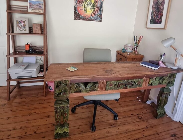 Elevated home in Batchelor on the edge of Litchfield National Park (full of waterfalls to swim in and walk around). The home office has a lovely view, with birds often feeding in the trees that line the window. Fully air-conditioned. There are outdoor seating areas under the house, on the deck, or you can chill out in the hammock and spa. The house has large tropical gardens and gated driveway. There is one bedroom with the spare room set up as a gym.