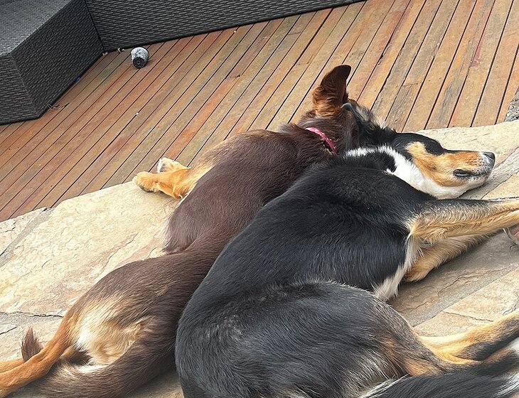 Dobby is cautious and sometimes anxious. He needs a daily medication. He doesn’t like men initially or men coming into the house. So ideally females only. Daisy is very affectionate and would cuddle you all day if you let her. They are both very happy playing with each other or lazying around outside. They have a doggy door which they use. We work during the day and they are happy at home on their own. At night they sit by your feet. They have crates to have some time out relaxation, but sleep on the couches at night. They love to go to an oval and run after the ball! Tgey pay little attention to other dogs or anyone when they are “ working the ball” Daisy is the boss and Dobby is happy just following Daisy.