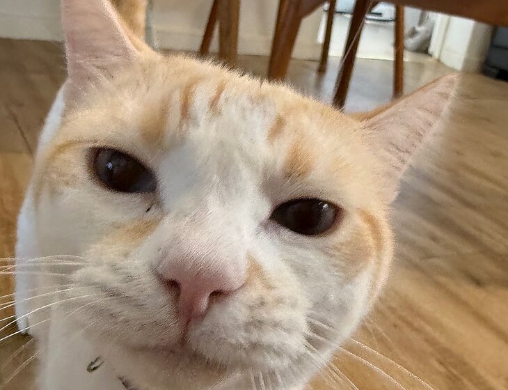 Trevor the big teenage cat, easy going and low‑maintenance, eating one meal a day and otherwise napping.