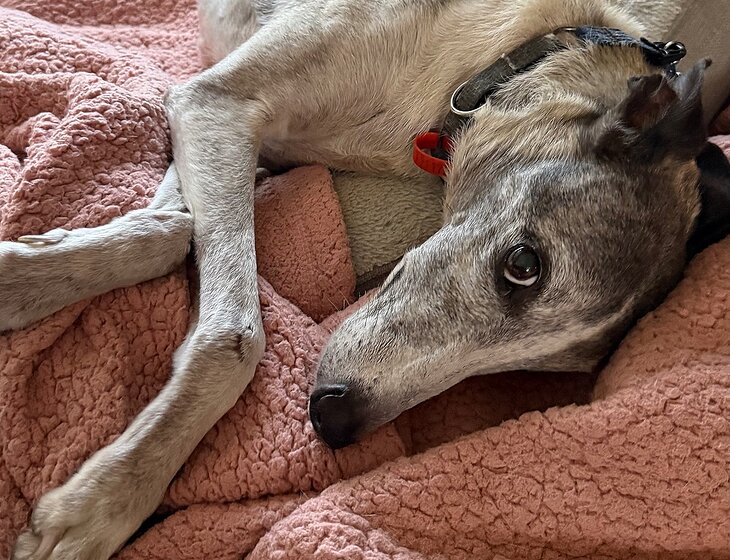 Dennis the elderly, very relaxed Whippet, fed morning and evening, with a once‑daily medication given at breakfast. He sleeps most of the day, doesn’t need walking, and is happiest with plenty of pats.