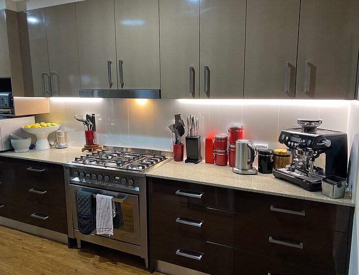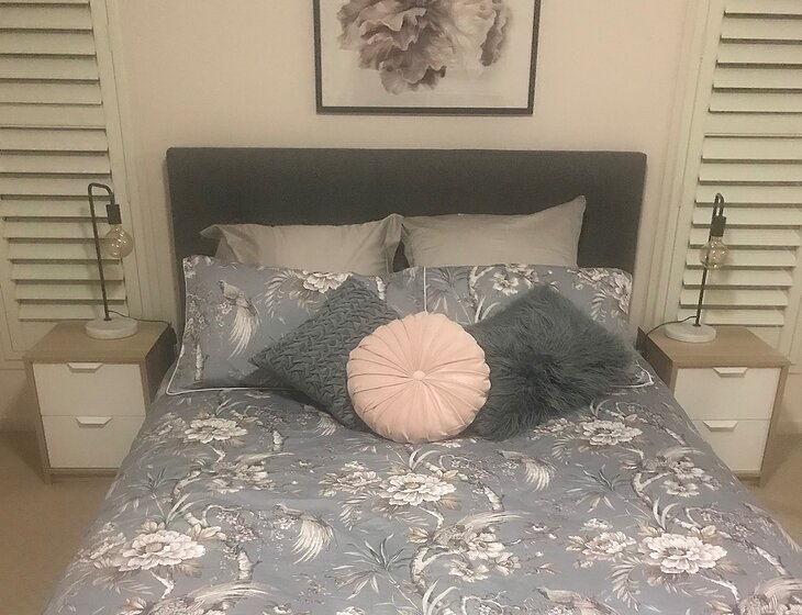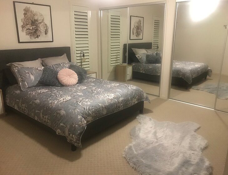 Our house is one level and with two spare beds. Plus master bedroom. We have ducted Airconditioning. A caravan would fit on driveway or front yard depending where our little van is at the time