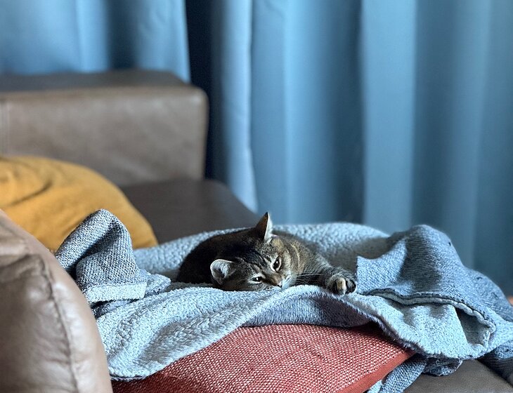 Rogue is a shy little cat that will most likely spend the first few days hiding but as soon as you are on the couch, you will have a buddy next to you!
