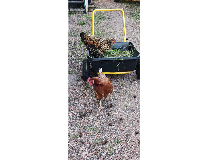 There are 4 hens who free-range in the garden during the day and are locked up at dusk to prevent fox and dog attacks. One is laying eggs at the moment.