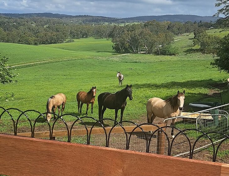 Our country home is situated on 80 acres in the Adelaide Hills, only 5 minutes from township of Birdwood. Our property is home to our pets including dogs, horses, highland cows, dwarf goats, sheep a pony and poultry. Our home is surrounded by gardens and has an outdoor spa area.
